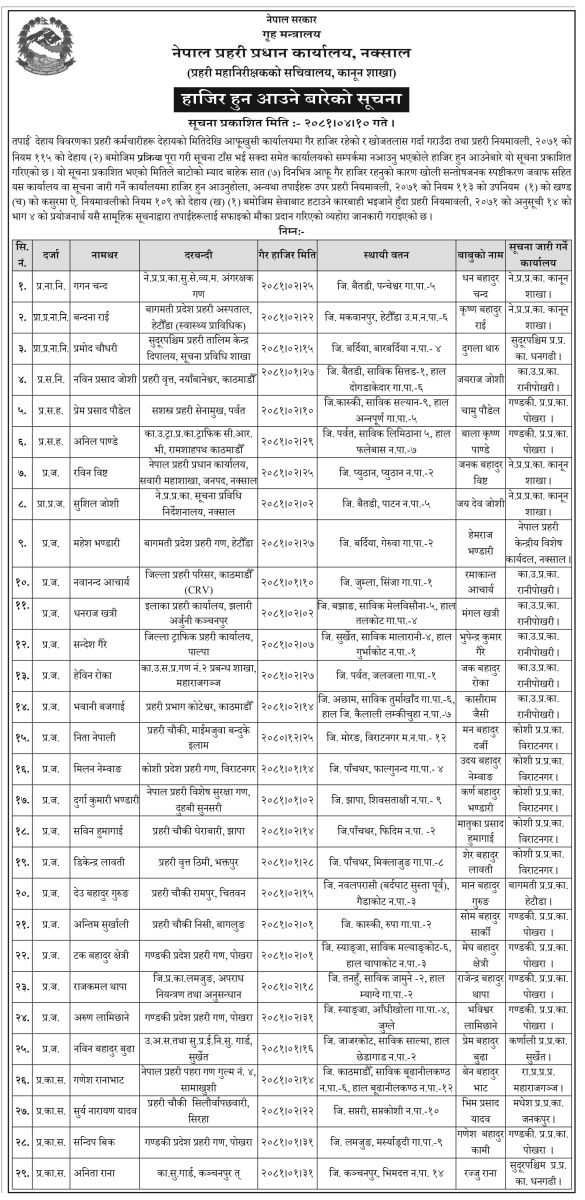 ‘यो सूचना प्रकाशित भएको मितिले बाटोको म्याद बाहेक सात (७) दिनभित्र आफू गैर हाजिर रहनुको कारण खोली सन्तोषजनक स्पष्टीकरण जवाफ सहित यस कार्यालय वा सूचना जारी गर्ने कार्यालयमा हाजिर हुन आउनुहोला, अन्यथा तपाईंहरू उपर प्रहरी नियमावली, २०७१ को नियम ११३ को उपनियम (१) को खण्ड (च) को कसुरमा ऐ. नियमावलीको नियम १०९ को देहाय (ख) (१) बमोजिम सेवाबाट हटाउने कारबाही भइजाने हुँदा प्रहरी नियमावली, २०७१ को अनुसूची १४ को भाग ४ को प्रयोजनार्थ यसै सामूहिक सूचनाद्वारा तपाईंहरूलाई सफाइको मौका प्रदान गरिएको व्यहोरा जानकारी गराइएको छ’, सूचनामा उल्लेख छ ।