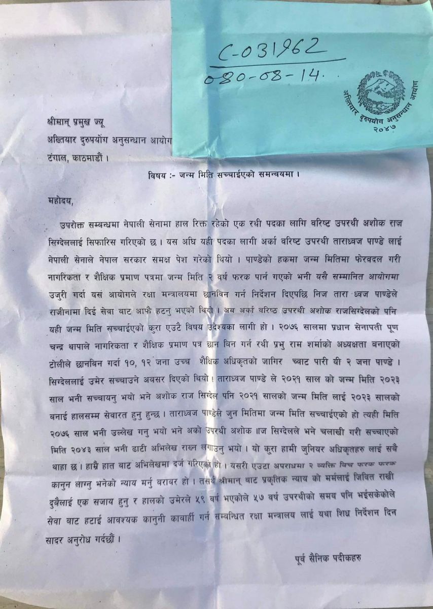 सिग्देलले शैक्षिक योग्यता र नागरिकताका प्रमाणपत्रमा किर्ते गरेर जन्ममिति सच्याएको भन्दै अख्तियार दुरुपयोग अनुसन्धान आयोगमा उजुरी परेको छ। सिग्देलको जन्म २०२१ र २०२३ साल गरी दुई पटक भएको प्रमाण फेला परेको छ। उनले नागरिकताको प्रतिलिपि निकाल्दा जन्म मितिमा हेरफेर गरेको भेटिएको छ। त्रिविको अभिलेख र एसएलसीको अभिलेखमा केरमेट गरी प्रमाणपत्र बनाएको भन्दै सेनाकै कर्मचारीहरूले अख्तियार दुरुपयोग आयोगमा सिग्देल विरुद्ध उजुरी दर्ता भएको थियो तर रक्षा मन्त्रालयले भने सिग्देलको शैक्षिक योग्यता र नागरिकताको प्रमाणपत्रमा कुनै कीर्ते नभएको जबाफ दिइसकेको छ । उनीमाथि दोहोरो नागरिकता लिएको र जन्ममिति किर्ते गरेको आरोप लागेको छ । सोही विषयमा सर्वोच्चमा दायर गर्न खोजिएको युवराज सफलको रिट हिजो दरपीठ भएको थियो ।